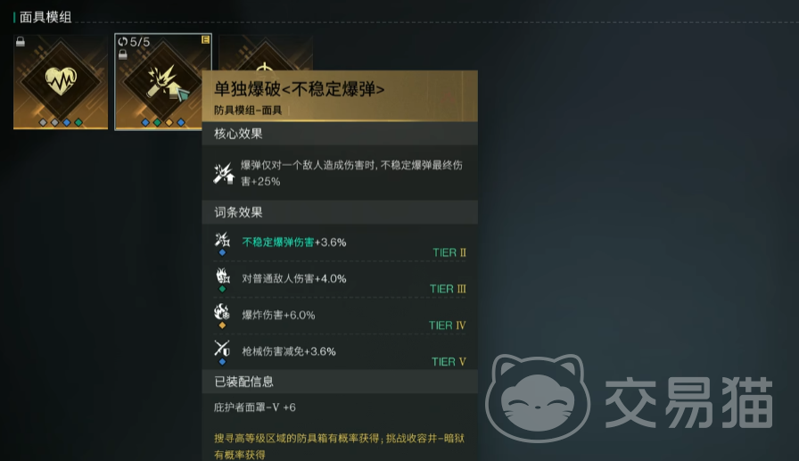 不稳定爆弹的核心效果是爆弹仅对1个敌人造成伤害的时候,不稳定爆炸最终伤害提升25%。词条方面可以刷增加不稳定爆弹伤害,对普通敌人伤害,爆炸伤害,枪械伤害等。