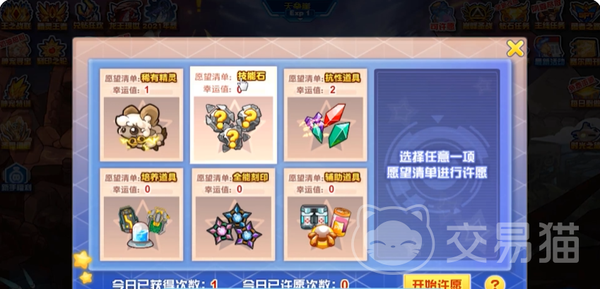 第一个“心愿漂流瓶”,每天上线便能够直接参加,只要在线的时间达到一定时长,就能获得对应许愿次数,每天最多可以许愿10次,有几率会抽取到精灵,道具,印刻,技能石,每失败一次会增加幸运值,幸运值越高下次许愿获得物品的概率越大,许愿失败能够获得心愿石,心愿石能兑换各种道具。