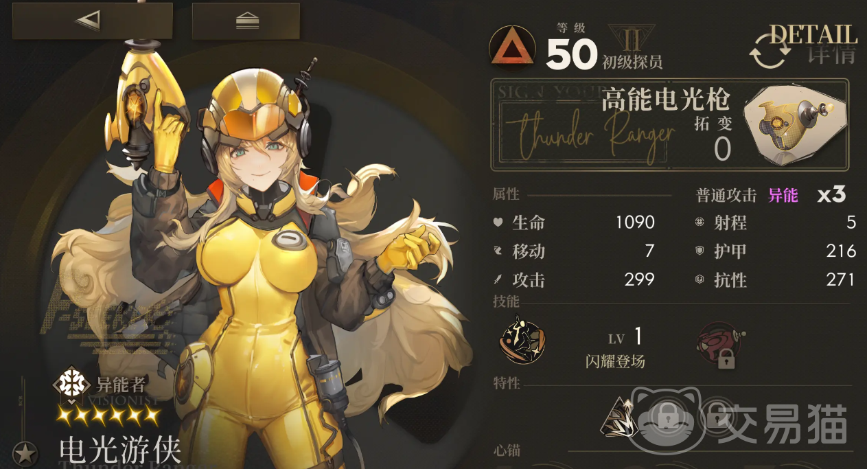 电光游侠十分热情、正义,加入超异猎手后默默为守护市民安全奔波,手中的封装体玩具光束枪能带来移动加2,且击败携带带电或迟滞的敌人时,使自身获得再行动的能力,她的闪耀登场能让自身普攻暴击率加100%且暴击伤害加10%,同时还能对周围五格范围内的敌人造成一回合带电效果,她的等离子光束会对前方3×6范围内的敌人造成一次160%的异能伤害,本次攻击会对生命低于50%的敌人提升50%暴击,她的被动一能在每次释放技能后提升15%攻击,被动2能让闪耀登场施加的带电回合加1,被动三能在战斗开始时提升15%的暴击率和伤害。