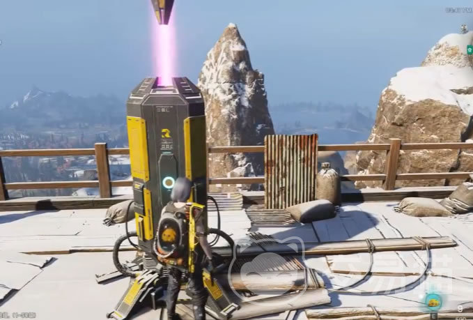 沿着这个木楼梯一路就走出了山洞,右侧位置可以看到空间锚点。激活后继续爬锚点后的木楼梯向上走,这时一路来到观景点,这里需要互动一下拍个照录入图鉴。这里附近平台上有一个武器箱可以开。