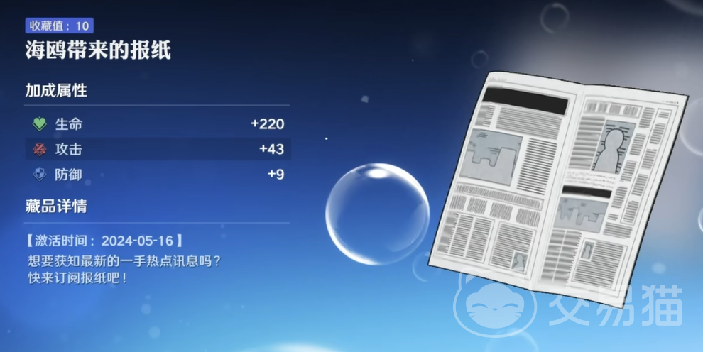 在游戏主界面中,偶尔会有海鸥飞来并发光。点击它后,便能获得这个特殊的藏品。海鸥在航海王的世界里象征着消息的传递,这份报纸也承载了玩家冒险的记录。