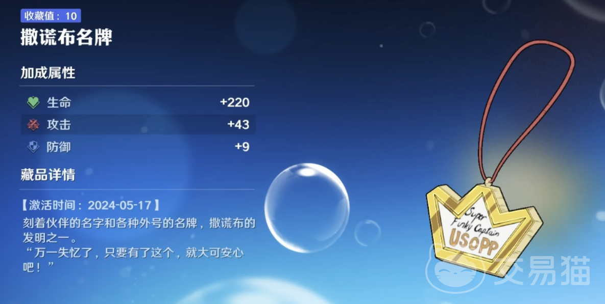 解锁乌索普后,前往工厂界面并点击他,即可轻松拿到这块“别具一格”的名牌。它诙谐幽默的设计非常符合乌索普的性格,也是粉丝们值得一收的趣味小物件。