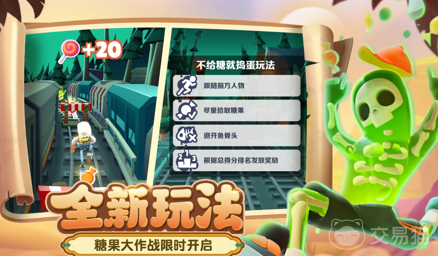 在这个模式中,跑酷者需要在三分钟的限时内避开鱼骨头,拾取尽可能多的糖果来获得分数,同时还需要注意避开随机变化的火车和障碍物,碰到障碍物或时间结识则一局结束,之后会给予参与者道具奖励,在排行榜前十的还能获得神秘周年大奖。