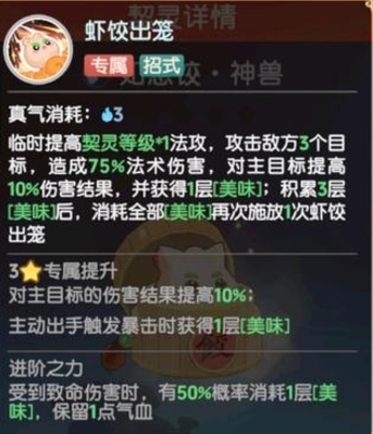 虾饺出笼技能在达到三星后,其效果将转变为提升主目标10%的伤害结果,虽然这一增幅相较于高级专注略显逊色,但暴击时却能额外获得美味数值,而虾饺出笼基础技能本身就提高了5%的暴击率,这使得美味的积累速度大大加快,成为如意饺叠加美味的核心机制,当虾饺出笼技能进一步进阶,如意饺在受到致命伤害时,有50%的概率能够保住一命。