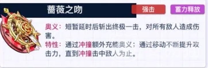 露丝忠于与陀螺手之间的契约,所以称号也被叫做蔷薇之吻,蔷薇之吻的奥义技能不仅仅是一次攻击,在这个技能激活后,经过三秒的紧张蓄力,这片战场上将绽放出一朵毁灭之花,对所有敌对单位施以相当于自身攻击力300%的打击,破坏力堪比爆炸效果,只要使用瞬间改变战场格局,当然如果对面有打断效果的话,需要大家精准捕捉敌方集群或不稳的时刻,使用这个大招才会达到理想的效果。