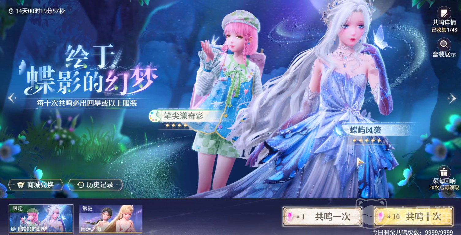 常驻池则是一直能够获取,抽卡可以获得基础的套装,同样也是按照五星到三星的品级来分类,同样是五星概率1.5%,满10保底四星满20保底五星,不会重复获得抽取到的套装,但是常驻卡池有个很有趣的玩法就是可以对抽取到的服装进行染色处理,染色后就会被视为全新的衣服,这样玩家就能抽取再次获得原有的时装。同时未集齐之前不会重复获得抽取套装,集齐之后获得的重复套装则可以转化为澎湃浪花与静谧水滴,这两个素材能在商城兑换新的抽取材料。
