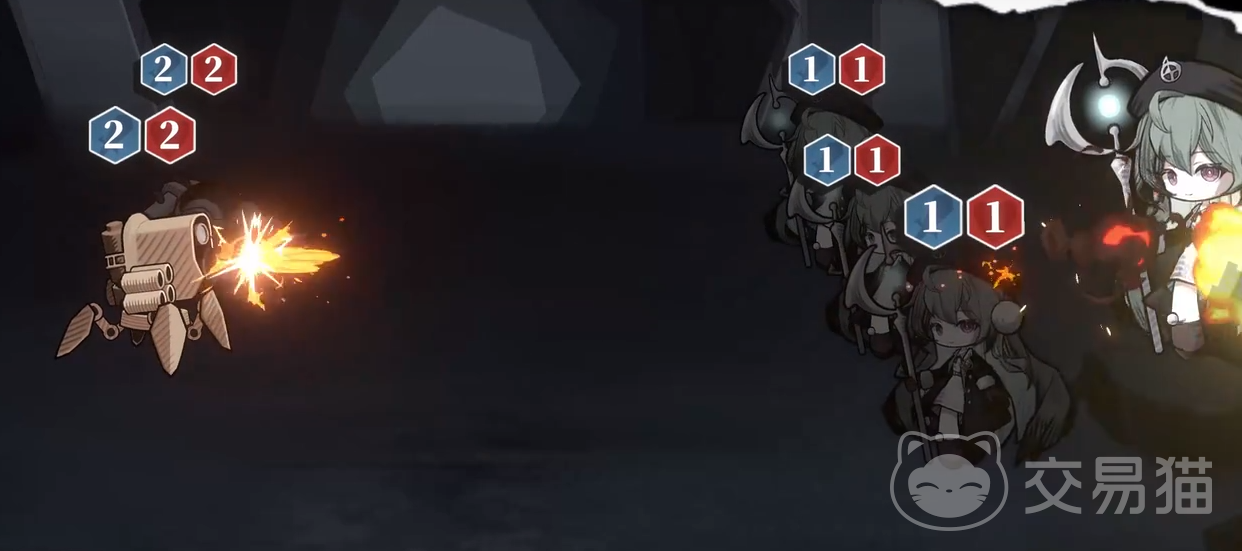 在我方回合结束后,敌方会召唤3个攻血都是1的单位上场。来到第二回合,我们如果抽到自走加特林的话可以将其上阵,它的能力是每一次轮回都会让攻击和血量永久提升1,而且它的攻击距离较远,对付数值比它低的敌方从属会有着特效。并且如果没有两个以上的遮挡,它还可以直接攻击到敌人本尊。第二回合我方会受到1点攻击,接下来回合一开始我们可以选择技能分支,因为敌人难度不算高,玩家们可以直接抽取一个从属这个技能分支的能力比较好。