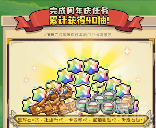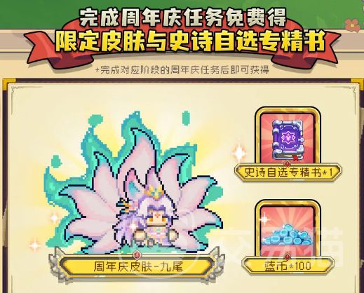 周年庆还会有专属的任务,完成所有任务的用户均可获取29星辉石、5张扭蛋币、三张卡包卷和两个宝箱钥匙,此外还有机会获得周年限定皮肤九尾、自选史诗专精书、蓝宝石等奖励。