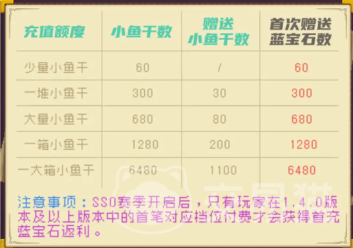 在周年庆期间玩家首次任意充值任意数量小鱼干还可领取传说自选专精书、蓝宝石、金币等奖励,具体赠送的蓝宝石数量会随着大家的充值数而增加,想要了解详细的小伙伴可以直接参考下图。