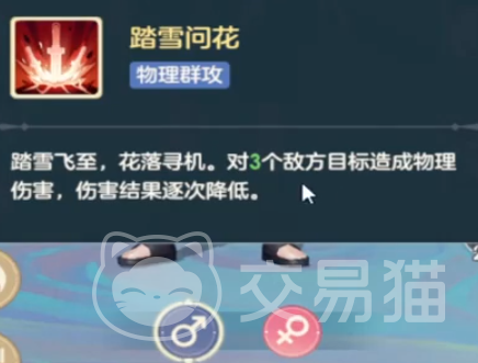 他的一技能是踏雪问花,这是他的群攻技能,这个技能是对3个敌方的单位来造成物理伤害,伤害的结果会依次进行降低,总体降低的幅度比较高。这个技能对付一些普通敌人的话还是比较好用的,但就是只能攻击3个单位比较少。