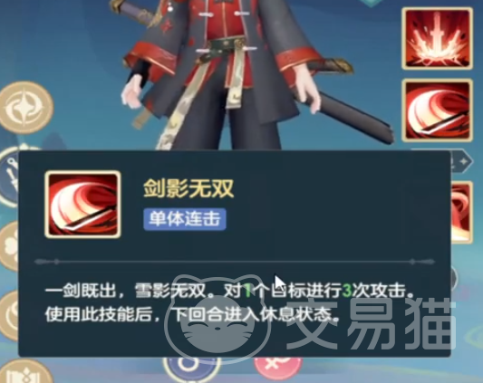 二技能是剑影无双,这个技能是剑歌的核心技能,他是一个对单的技能,效果是对一个敌人造成3次物理伤害,这个伤害每一次都会比上一次更强一点,在使用了技能之后,我们在下一回合会需要休息一回。