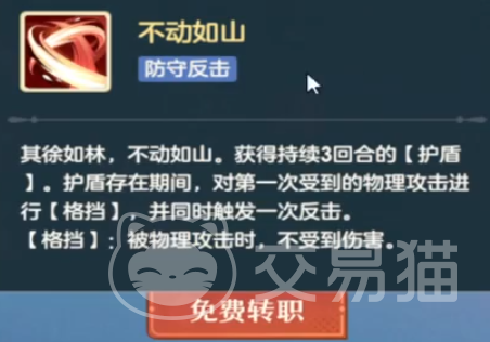 最后一个技能是不动如山,这个能力是一个防守反击的能力,它的效果是释放一个3回合的护盾,在存在期间我们受到的第一次伤害可以进行格挡并触发反击,格挡状态下我们不会受到伤害。