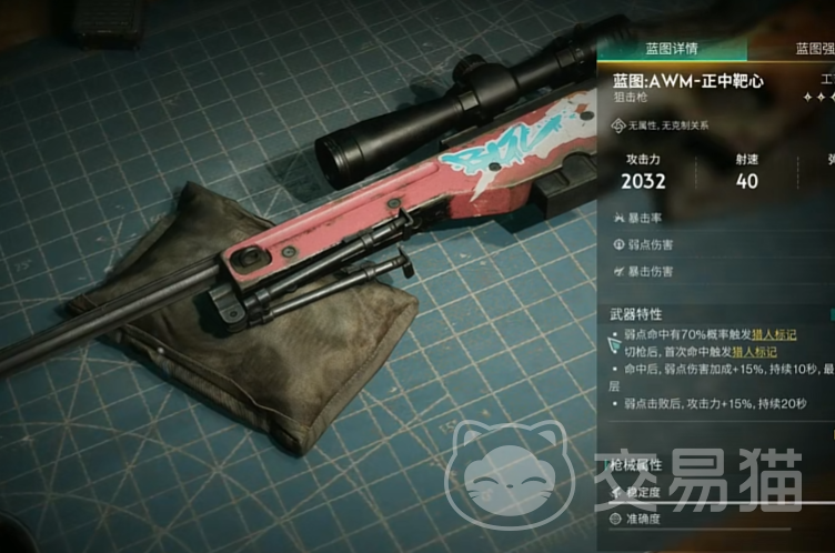 大家在获得这个awm正中靶心的蓝图后,可以先简单的看一下枪械的数值,武器都是拥有特殊的特性的,而这个武器则是可以命中敌人后,给敌人带来一个弱点标记,可以出发猎人标记效果,并且玩家们在尽显切枪的时候,同样是可以获得一个标记效果的,在成功命中敌人后,可以获得弱点加成伤害吧,并且持续一段时间,最高可以叠加三层的弱点伤害!