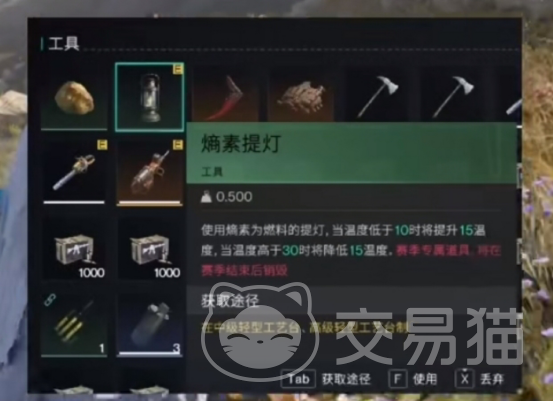 熵素提灯对于想要去体验雪国人生这个剧本的玩家们来说,几乎算得上是必不可少的一个道具,不论是在极寒的天气之下,还是在高温的环境里面,它都有着可以调节整体温度的作用。如果玩家所处的地方是雪天的极寒环境中的话,那它就可以将这里的温度往上调节15度,反之当玩家处于异常的炎热地点时,它就能将该地点的温度往下下降15度。