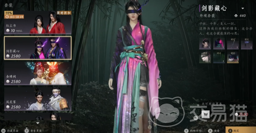 ”剑影藏心”这套时装需要在商店花费2580长鸣珠购买整个套装,包含发型和服装,赠送头饰、眼罩。主色调是紫色、粉色,还有绿色。腰间系着一条宽大的腰带,腰带上挂着一些装饰品。背景是竹林,整体环境显得非常幽静。而人物还戴着一个黑色的眼罩,给人一种神秘的感觉。