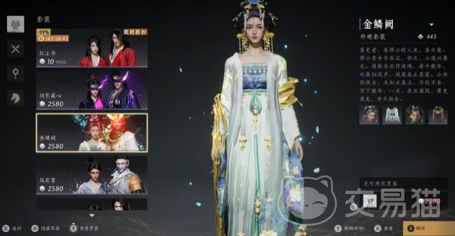 “金鳞阙”,这整套时装需要2580长鸣珠购买,服装主要是浅蓝色和白色为主色调,还有一些金色的装饰,给一种非常精致和高贵的感觉。头上盘起了复杂的发髻,还有金花耳环,非常典雅尊贵。背景种还有一些光点和花瓣的效果,增添了几分梦幻感。