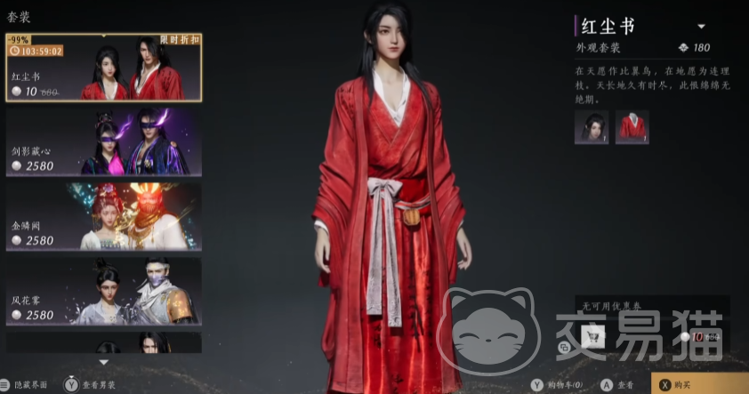 “红尘书”,这套时装目前有特价,不仅有服装还有发型,一整套放一起才需要10长鸣珠。其实这套就是侠侣时装,可以理解为婚装,需要侠侣关系等级达到3级才能穿。
