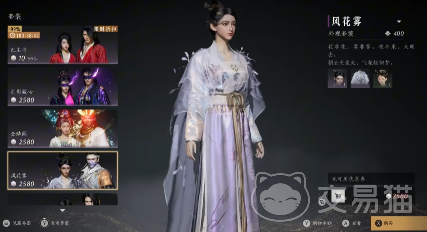 “风花雾”,整套时装也需要2580长鸣珠购买,有点像是汉服,衣服上有精美的花卉图案,主色调是淡紫色和白色。发型也是那种很传统的发型,头发盘着竖起,整体造型给人一种古典、优雅的感觉。