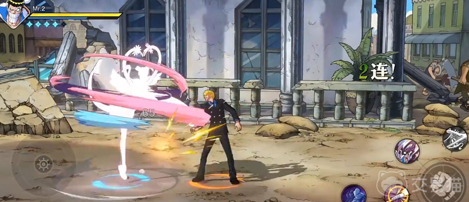 Mr.2的第一个技能会像芭蕾舞演员一样高速回转攻击,最后以飞踢作为终结,在旋转的期间可以自由移动,如果此时持续按住技能按键会持续攻击,奥义使用完后该技能还会得到强化。