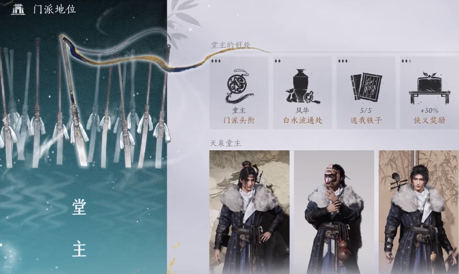 除了这些之外,在游戏中玩家能选择加入门派来修习功法,在门派中还有职业进阶的玩法,具体是通过门派贡献值来提升职位。当然喜欢自由的玩家在游戏中做个散人也很不错。