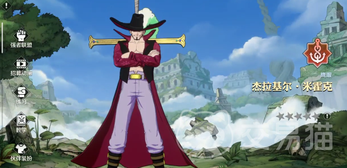 每个伙伴有着不同的风格,这里以米霍克(鹰眼)为例,他属于是华丽风格的,技能会消耗精力值,精力值是自动回复的,打中敌人则会提升自身的奥义点数。每个角色都有援护技,战斗的时候是无法使用援护技的,只有作为援护角色使用才能释放,有一些角色是援护,无法使用他们战斗,仅能通过援护释放出来提供支援。