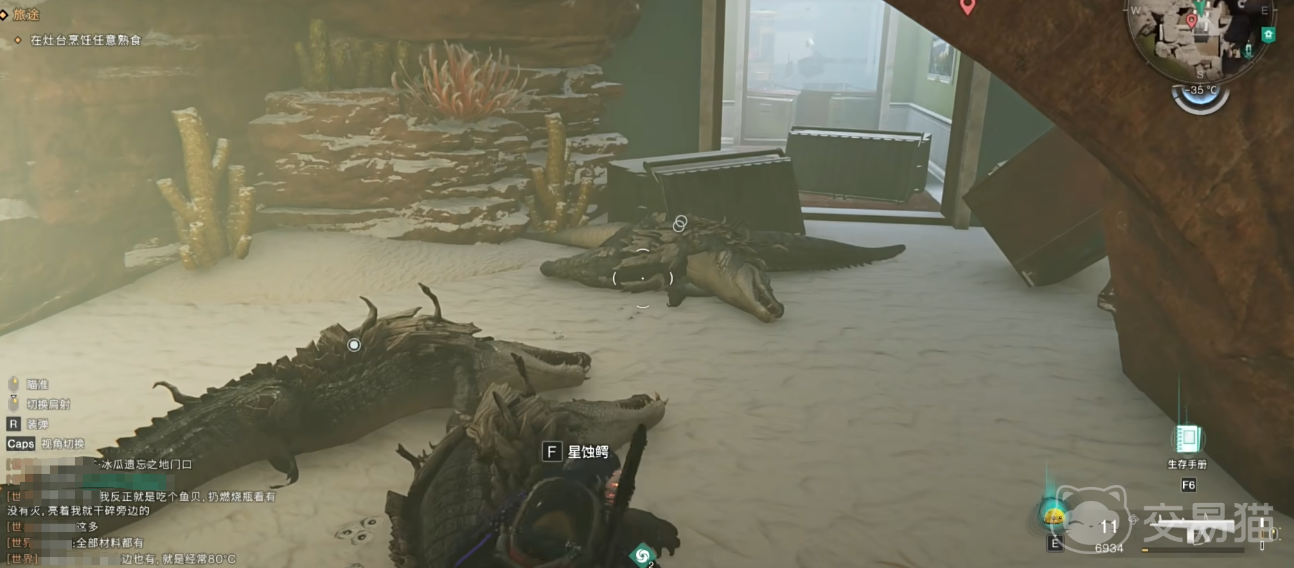 接下来,大家可以在房间中发现鳄鱼,通常来说房间内有六只鳄鱼。使用武器击杀鳄鱼,即可获取鳄鱼皮。但是在武器装备选择上,大家应确保武器具有足够的伤害输出,以便快速有效地击杀鳄鱼。