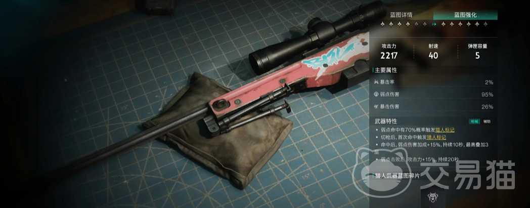 这是一把狙击枪,稀有度比较高,是金色品质的武器。作为最高品质,那么它的实力自然非常强悍。首先是攻击力方面,达到了惊人的316。虽然说它的射击速度不是很占优势,弹匣容量不算大,但是重点在于,它可以对敌方弱点造成额外95%损伤,让敌人一次性多受到多少伤害。另外它还有一个特性,但凡命中了目标的弱点,有70%的几率给改目标附加一个狩猎标记,切换武器的时候,又或首次击中对手,都是可以将这个效果触发的,这样弱点伤害能增强15%,输出效果肉眼可见。