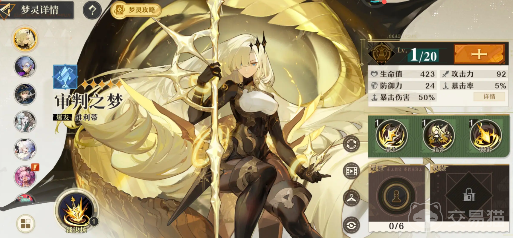 维利蒂就是审判梦,她可以说是目前最强的范围伤害角色,如果需要大量清场自然少不了她,她的普攻是对着前方发起三段攻击,前面两段每次都会降下一道闪电,每道能造成130%伤害,第三段会连续降下来三发并且附加雷罚造成64%的伤害,她的生存招式是向着前方进行闪现,期间能免疫任何伤害,终点处还会召唤闪电,她的特性技是在进行蓄力后,向四周发出六个圆形场地,它们会自行移动,对沿途范围内的所有敌人每秒造成一定伤害,而且移动的时间越长,后续的伤害也就越高。