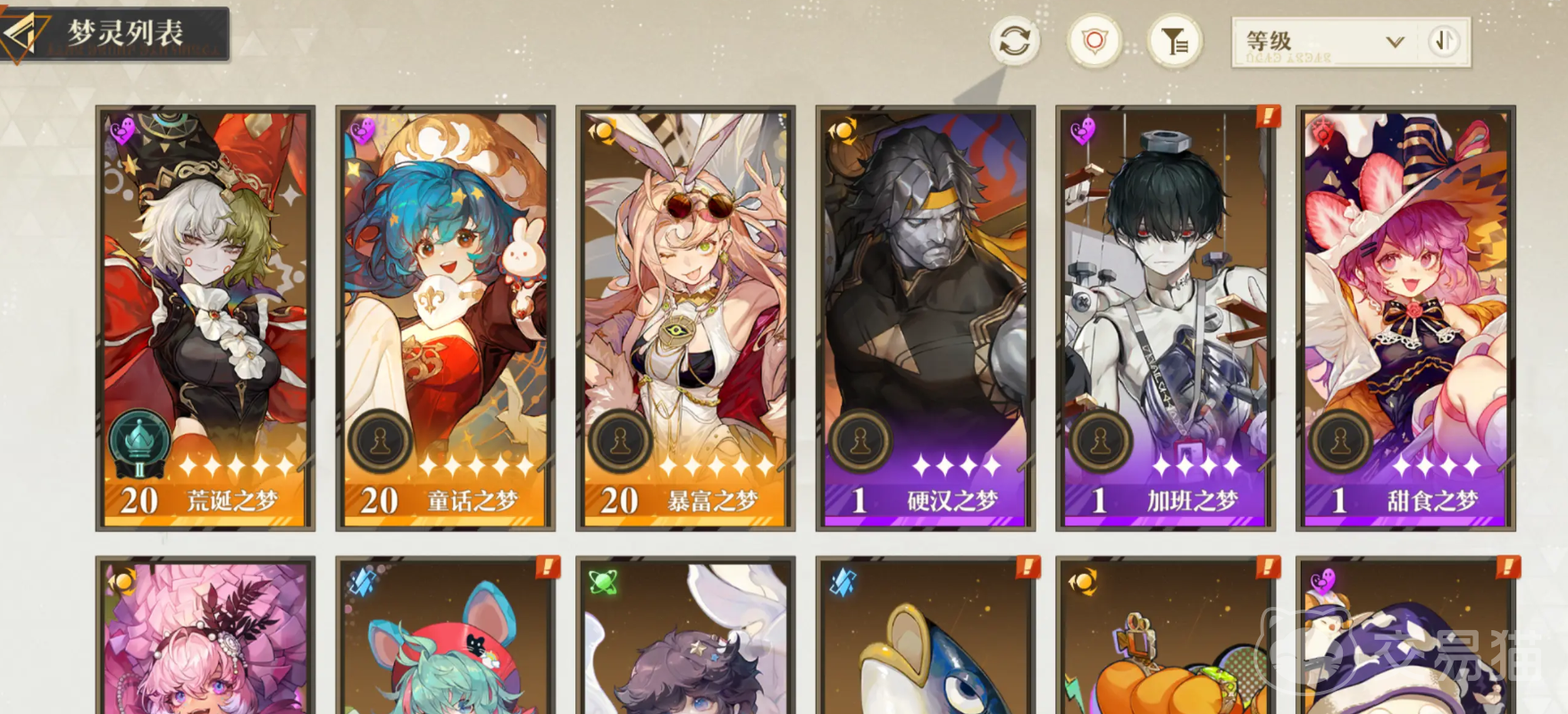 游戏的关卡可以用来主要获取资源,所有角色的进阶和升级所需材料都能通过它来获取;空想小镇能用抽卡获得的副产物和货币等来换取材料,也能帮助提供梦灵们的好感度,好感度高就能得到梦灵模因,进一步增加它们的实力让闯关更加轻松;最后每日激励也是新手不容错过的,通过它能获得经验、抽卡道具和培养资源,这个核心玩法是扭蛋,每天每人会有四次刷新机会,出来不同的激励任务,基本上难度都不算太高,建议每天完成,这对新手开荒阶段非常重要,能在短时间内提升角色战力。