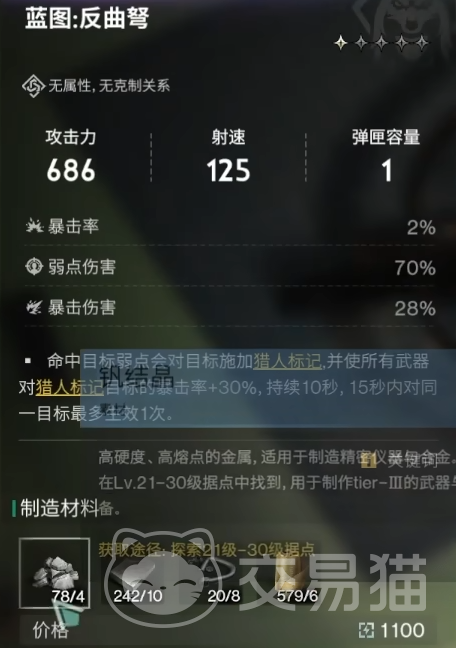 猎人标记一般玩家们提及比较多的装备便是反曲弩。这个前期的神器的被动效果便是在命中敌人弱点的时候可以对敌人施加猎人标记,这个标记的能力是我们在对标记敌人造成伤害的时候可以提升自身的暴击率,暴击率最多可以提升30%。持续10秒,在15秒内对同一目标最多生效一次。
