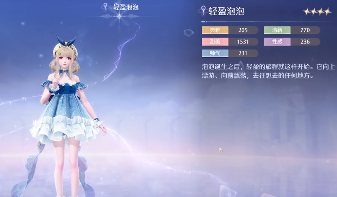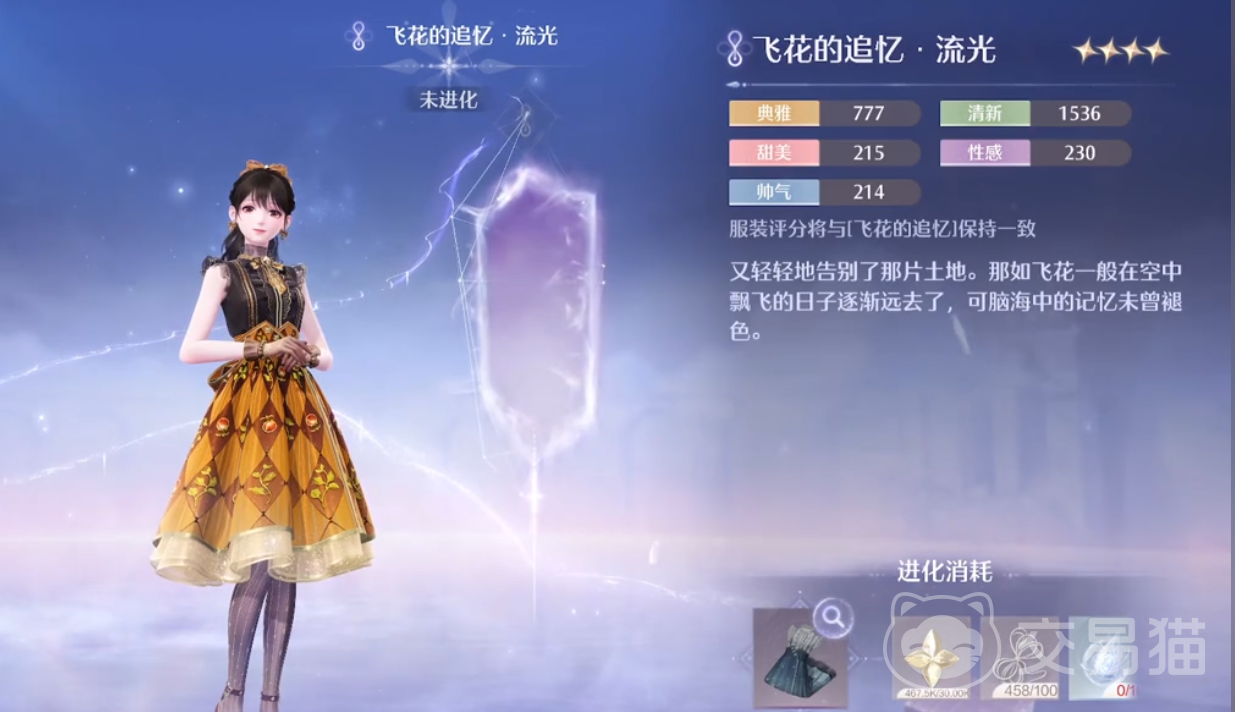 第四套叫做飞花的追亿,可以提供空中慢慢向下漂的能力,进化后的样子如下图所示,比较典雅。第五套叫做琴弦之诗,角色穿上它后就可以演奏动人的小提琴曲,目前也没有开放进化。