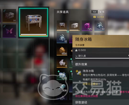 像这种随身冰箱对于新手玩家并不是特别推荐耗材,而且负重又是非常大的,在中后期拿到一些珍惜资源,然后可以开启随身冰箱,对于前期的话,玩家们开启一个普通冰箱就足够日常使用了,在此再说一个小tip,普通冰箱的话,切断电源就可以让你拥有一台永久保鲜机,这种操作不知道在正式公测时期是否还会出现,小伙伴们可以期待一下。