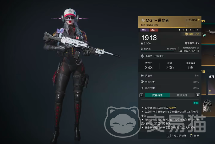 最后一把压轴出场的是MG-4猎食者,这把枪支的基本属性首先是命中40%的概率触发快枪手;每次快枪手达到五层的时候可以获得0.5秒的无限子弹;在持续攻击相同目标时,每次命中伤害可增加2%,最高40%,切换目标后重置;在剩余子弹超过弹药容量50%的时候,攻击力可增加40%,其实从这些词条对比来看的话,他的第三个词条能够保证玩家在打雪国boss或者是精英怪的时候会有着非常高额的伤害,并且这个boss血越厚,玩家持续的攻击时间越长,那么所达到的伤害也就越高。