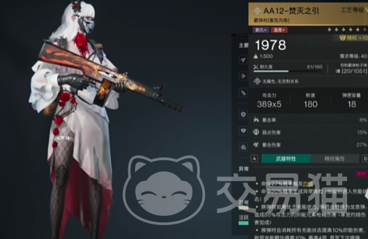 第二把武器装备狂推AA12焚灭之隐,作为一把长机枪武器,不仅有着非常不错的暴击指数,而且在弱点伤害的加成上也是非常不错的。当其子弹命中敌人时可发生大片灼烧,并且还可通过异常微粒的拾取完成充能。在充能完毕以后进行弹药的替换,可直接将普通子弹变成为龙吸子弹,在换弹消耗方面可以使所有的充能提升并且完成高灼伤伤害,整体来看,这把枪支的输出上限非常之高,不过在输出环境要求上是有一些苛刻的,对于喜欢贴脸开大的玩家可以尝试养成,综合来看也是在T0阶。