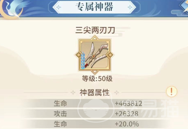看完上面的介绍之后,玩家对于河图寻仙记杨戬就有了深入的了解,另外也需要了解一下专属的武器,专属的武器就是三尖两刃刀。这把武器不仅可以在暴击时有效增加攻击力,还能够提升暴击伤害以及增加减免伤害,进一步的提升输出能力,还有伤害能力。