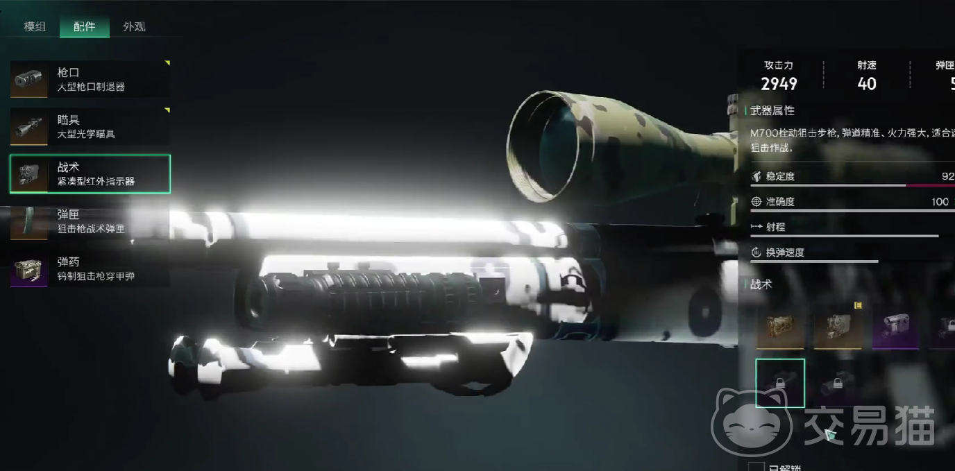 若玩家顺带将弹匣进行了切换,并且携带的是战术型轻便弹匣,举枪的速度将会提升到四十点,几乎是没有任何前摇就可以举枪,固然这个战术武器装配,比较适合狙击枪搭乘。