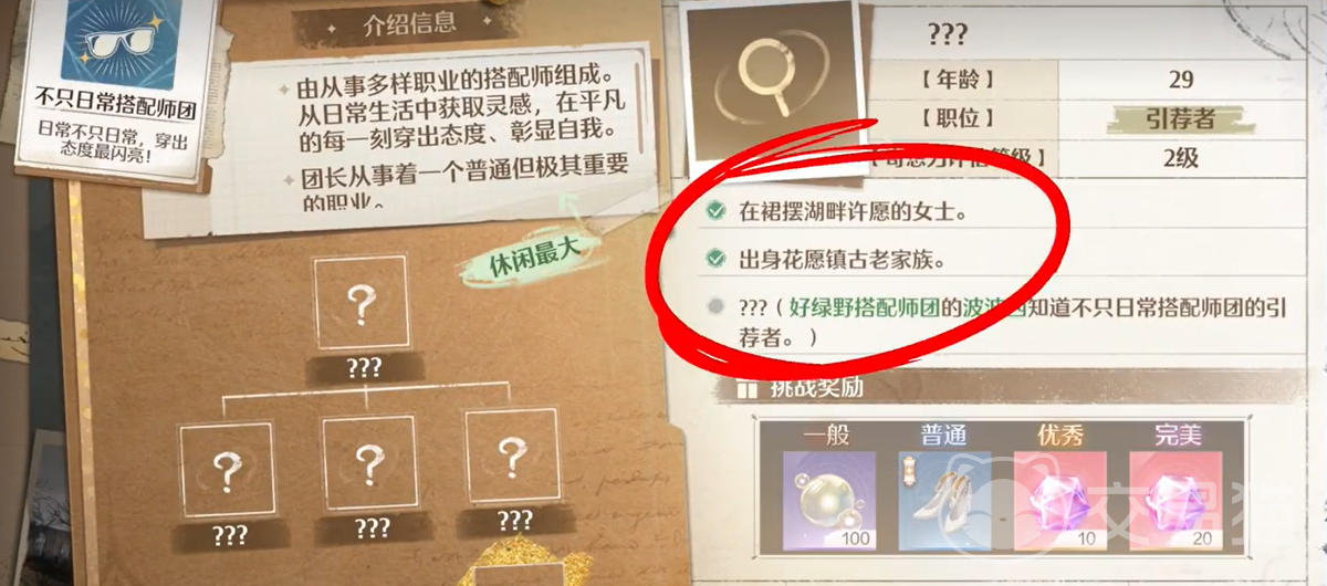 平时搭配主要的板块就在搭配势力里,小伙伴们第一天上线的时候就可以解锁,每一个搭配势力里面都会有不同的NPC等待大家挑战,挑战成功的话会获得一些时装和道具奖励,这里要注意的是优秀和完美程度获得的奖励是不一样的。至于搭配的条件在页面上也会展示给大家,小伙伴们根据要求去搭配就可以了。