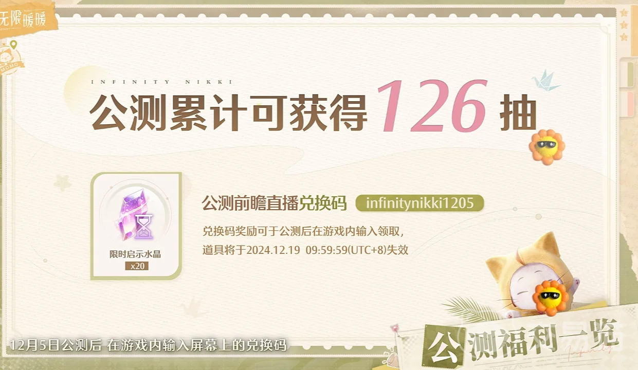 此外,有小伙伴统计过,公测之后大家可以得到的福利也有很多,而且共计可以得到126抽的抽卡道具,对于喜欢抽套装的小伙伴来说简直“馋哭了”。首先就是前瞻的兑换码:infinitynikki1205,可以得到20个水晶。