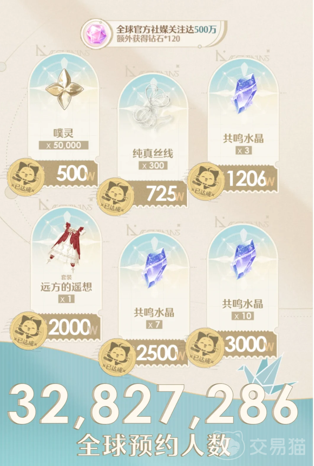 目前的预约里程奖励有5万噗灵,300的纯真丝线材料,20个共鸣水晶,一件远方的遥想裙子,这些是大家登陆就能拿到的。