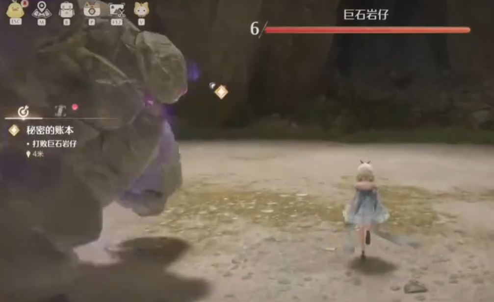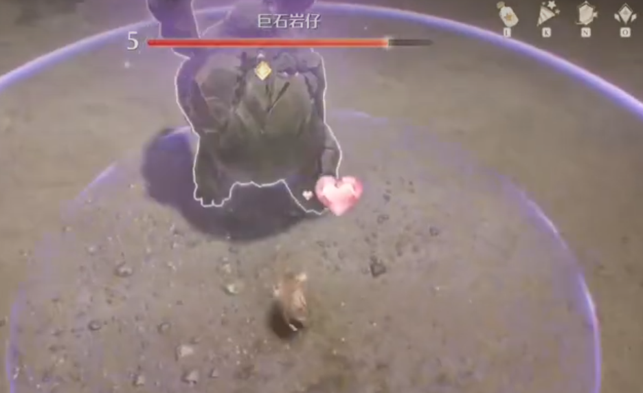 它在攻击完后,此时我们能发现它的身上会出现一个紫颜色的水晶,其实也就是核心,平常攻击它不会起效,但只要攻击内核就会扣血,它血条左边的次数就代表了剩余血量,开局的时候是六,也就是说击中六次就能顺利消灭巨石岩仔。