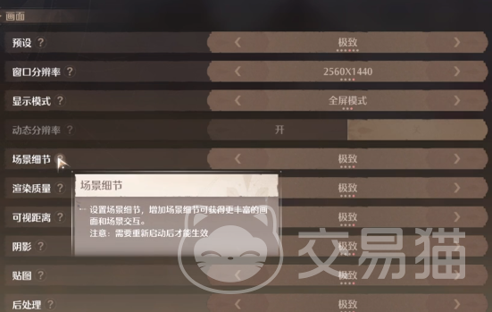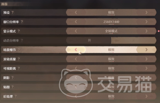 场景细节:游戏不卡顿的情况下自然是调的越高越好,因为这直接就关注到画面的丰富程度,其中也会包括场景中的植物数量,还有动物数量以及落叶飞花。