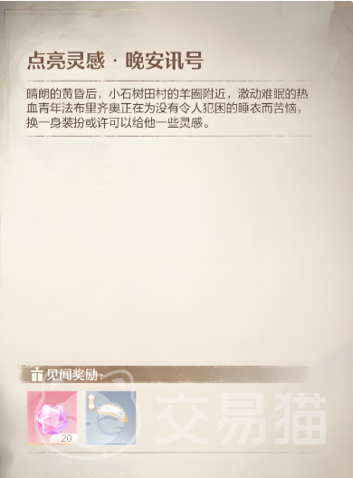 它作为见闻任务,完整的名称是”点亮灵感7·晚安讯号”。该任务需要在先去往羊圈附近,在这边可以看到一个青年NPC,他叫做法布里齐奥,他陷入了激动难眠的状态中,正因为入睡困难而感到苦恼。