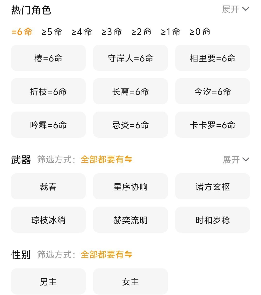 也有一部分玩家可能退游很久不知道号里面哪些东西价值比较高,那就可以在APP的鸣潮交易专区中打开筛选按钮,就可以看到热门角色以及命数、还有武器和性别等等,玩家们通过勾选自己账号中所拥有的资源点击确认就可以定位到和自己的账号最相符的商品,通过对其卖价的剖析和验号报告的进一步对比就可以判断出自己的账号价值,不至于卖的太低。