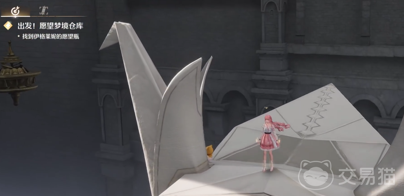 在顺利接到后,玩家还需要完成前面的钓鱼和解谜等小任务,紧接着在悬崖附近就会刷新一个特殊的千纸鹤,看到后我们立刻跟着提示来到它的身边,然后直接踩在千纸鹤的背部。