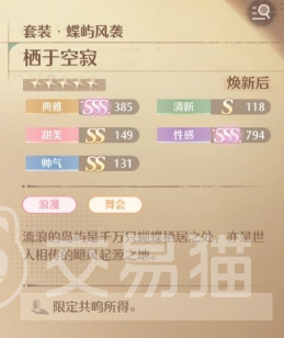游戏中当大家获取一件服装后,就可以查看这件服装的详情况,通过查询就能发现这服装拥有着评分,分为好几项,分别对应着不同的服装标签,就比如典雅、清新、性感这种。