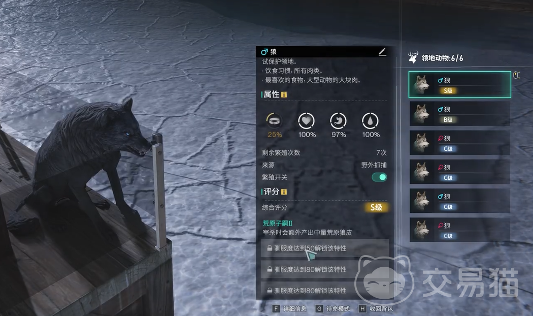 对于那些对狼皮需求量较大的玩家来说,单纯的捕杀或者解剖可能效率较低。在这种情况下,繁育狼群便是一个非常有效的途径。只要你捕捉到一只拥有“草原子嗣”特性的狼,并将其与其他狼进行配对,繁育出来的小狼同样会继承该特性。通过这种方式,玩家可以稳定获得具有该特性的小狼,并通过它们获得更多的狼皮。这种繁育方法虽然需要一些耐心,但一旦建立起稳定的狼群,狼皮的获取将变得轻松无比。