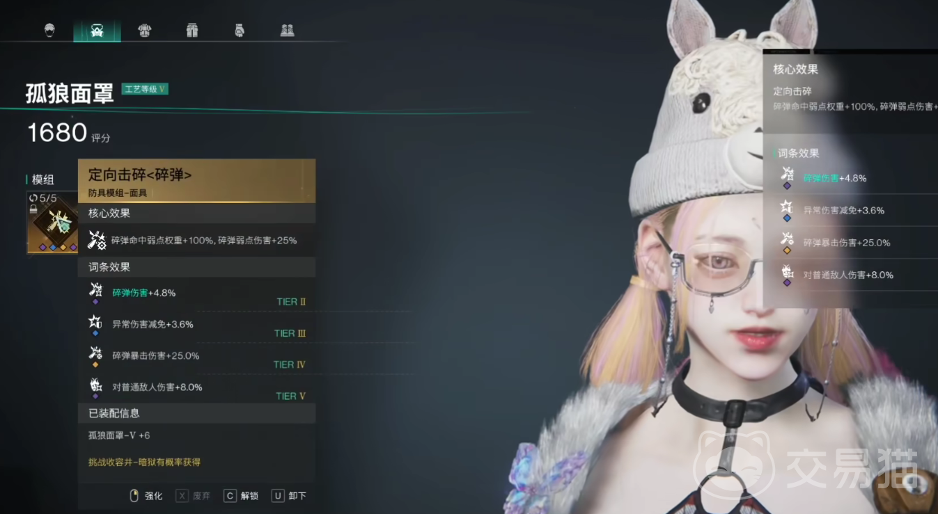 孤狼面罩可以增加最后的勇气碎弹效果,并且增加碎弹伤害至少4.8%,倘若敌人正处于异常属性的buff之中,那么携带孤狼面罩,就会有至少20%的基础攻击倍率加成。