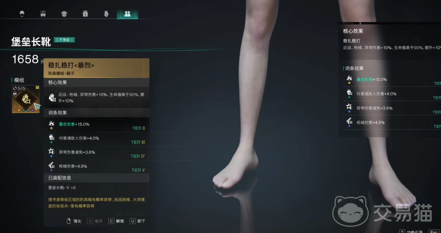 堡垒长靴具有增强玩家暴击伤害的能力,当玩家凑齐了堡垒长靴的稳扎稳打buff后,他能够增强玩家近战和枪械的基础伤害至少50%,并且堡垒长靴还有一个特殊技能,那就是玩家的生命值低于90%时,异能属性值会增加10%,不止如此,堡垒长靴非常适合玩家进入到pvp战斗当中,由于它对敌伤害能够至少增加4%,配合最后的勇气碎弹炸裂效果,能够发挥出极强的输出伤害。