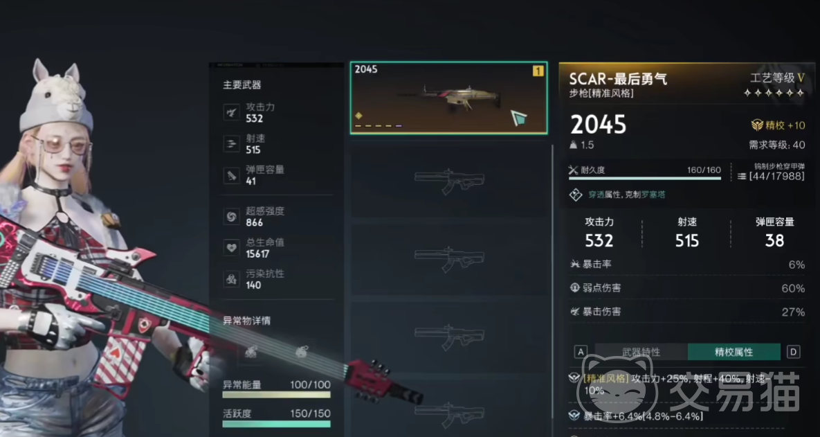 最后的勇气属于突击步枪,基础攻击数值为532点,射速高达515点,弹匣容量为38枚,基础暴击率为6%,弱点伤害最高可以叠加到60%,整体暴击伤害是游戏当中最高的,足有27%,在特殊效果搭配了精校属性后,其基础攻击力和射程都会得到加成,但是射速会降低10%,完全触发精校后,还能够进而获得暴击率加成6.4%。