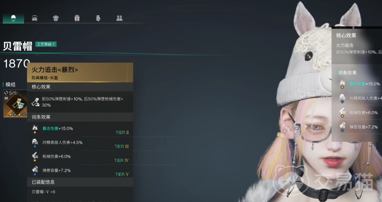 贝雷帽则是游戏当中一个中规中矩的配件, 它能够增加玩家60%的弹匣换弹速度,并且能够提升玩家50%的机械伤害,无论搭配枪械还是搭配近战武器,它都有着不错的发挥,不只如此,贝雷帽还能够增强玩家的弹匣容量7.2%,配合套件当中的步枪扩容弹匣,至少能给玩家提供五十枚的弹匣容量。